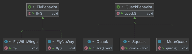fly 집합에는 나는 다양한 방식의 클래스 들이 구현되어 있고, quack 집합에는 소리내는 다양한 방식의 클래스 들이 구현되어 있습니다.