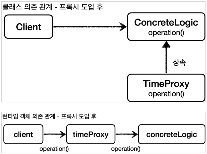 위 코드에서 핵심은 ConcreteClient 의 생성자에 concreteLogic 이 아니라 timeProxy 를 주입하는 부분이다.