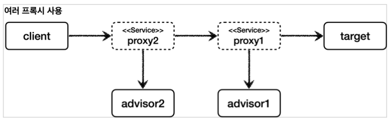 스프링은 AOP를 적용할 때, 최적화를 진행해서 지금처럼 프록시는 하나만 만들고, 하나의 프록시에 여러 어드바이저를 적용한다.