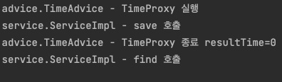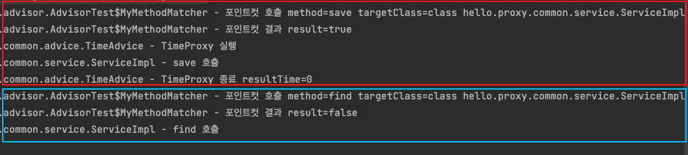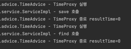 실행 결과를 보면 기대한 것과 같이 save() 를 호출할 때는 어드바이스가 적용되지만, find() 를 호출할 때는 어드바이스가 적용되지 않는다.