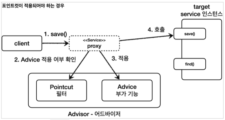 - 포인트컷에 Service 클래스의 save() 메서드에 어드바이스를 적용해도 될지 물어본다.