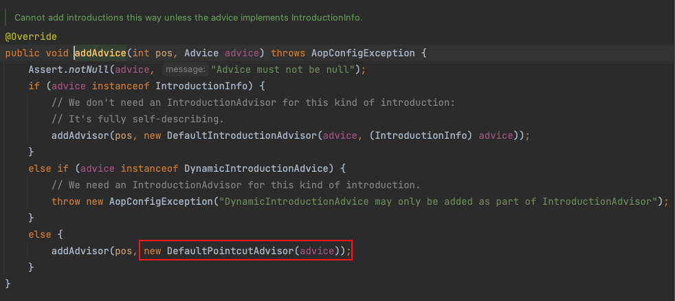 addAdvice 내부를 보면, DefaultPointcutAdvisor()를 호출하게 된다.