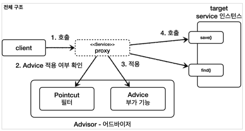 정리하면 부가 기능 로직을 적용해야 하는데, 포인트컷으로 어디에? 적용할지 선택하고, 어드바이스로 어떤 로직을 적용할지 선택하는 것이다.