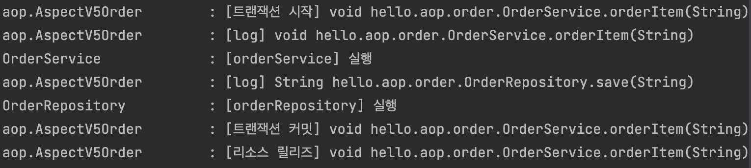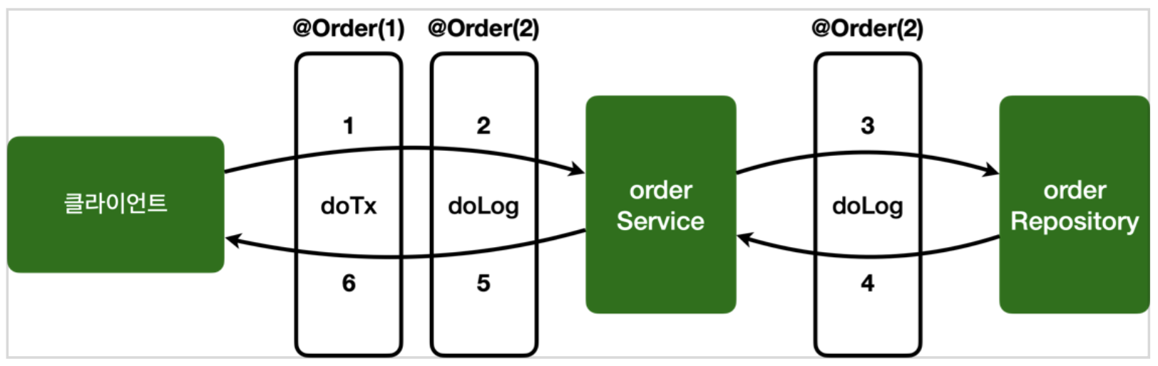 물론 @Aspect 안에 동일한 종류의 어드바이스가 2개 있으면 순서가 보장되지 않는다.