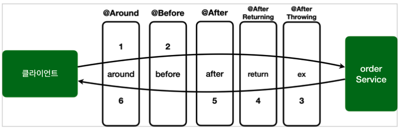 실행 순서: @Around , @Before , @After , @AfterReturning , @AfterThrowing