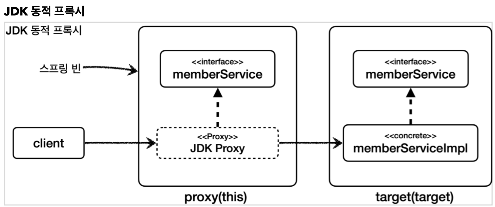 this는 Proxy 객체를 보고 판단하는데, JDK 동적 프록시로 만들어진 proxy 객체는 MemberService 인터페이스를 기반으로 구현된 새로운 클래스다.