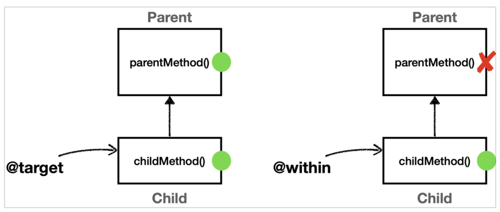 parentMethod() 는 Parent 클래스에만 정의되어 있고, Child 클래스에 정의되어 있지 않기 때문에 @within 에서 AOP 적용 대상이 되지 않는다.
