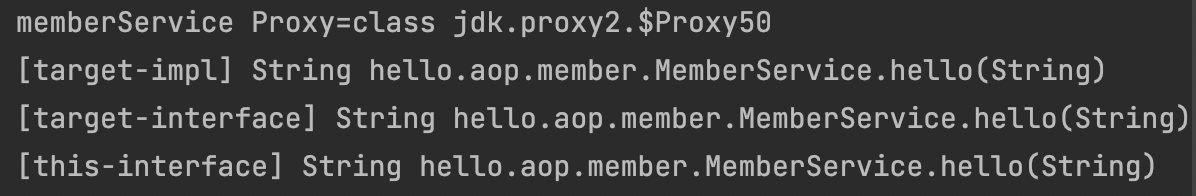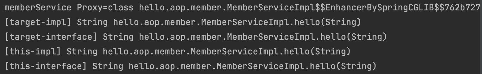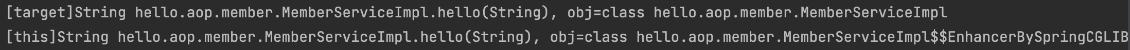 실행 결과를 보면 target은 MemberServiceImpl 이라는 실재 대상 객체를, this는 CGLIB Proxy를 전달받은것을 알 수 있습니다.