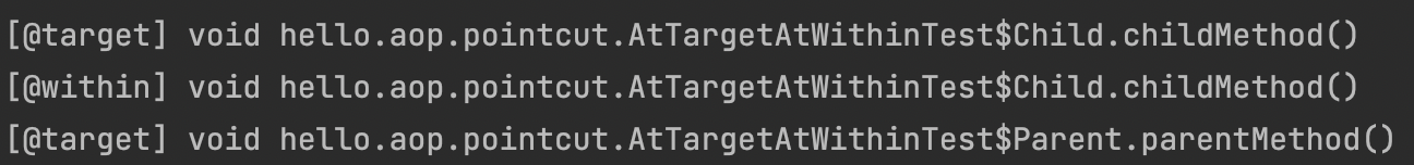 실행결과를 보면 child.parentMethod() 를 호출 했을 때 [@within] 이 호출되지 않은 것을 확인할 수 있다.