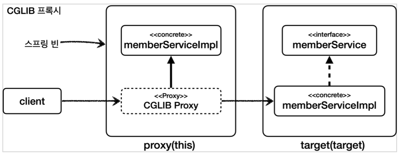 - CGLIB: 인터페이스가 있어도 구체 클래스를 상속 받아서 프록시 객체를 생성한다.