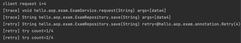 ExamRepository.save() 메서드에 @Retry(value = 4) 를 적용했다. 이 메서드에서 문제가 발생하면 4번 재시도 한다.