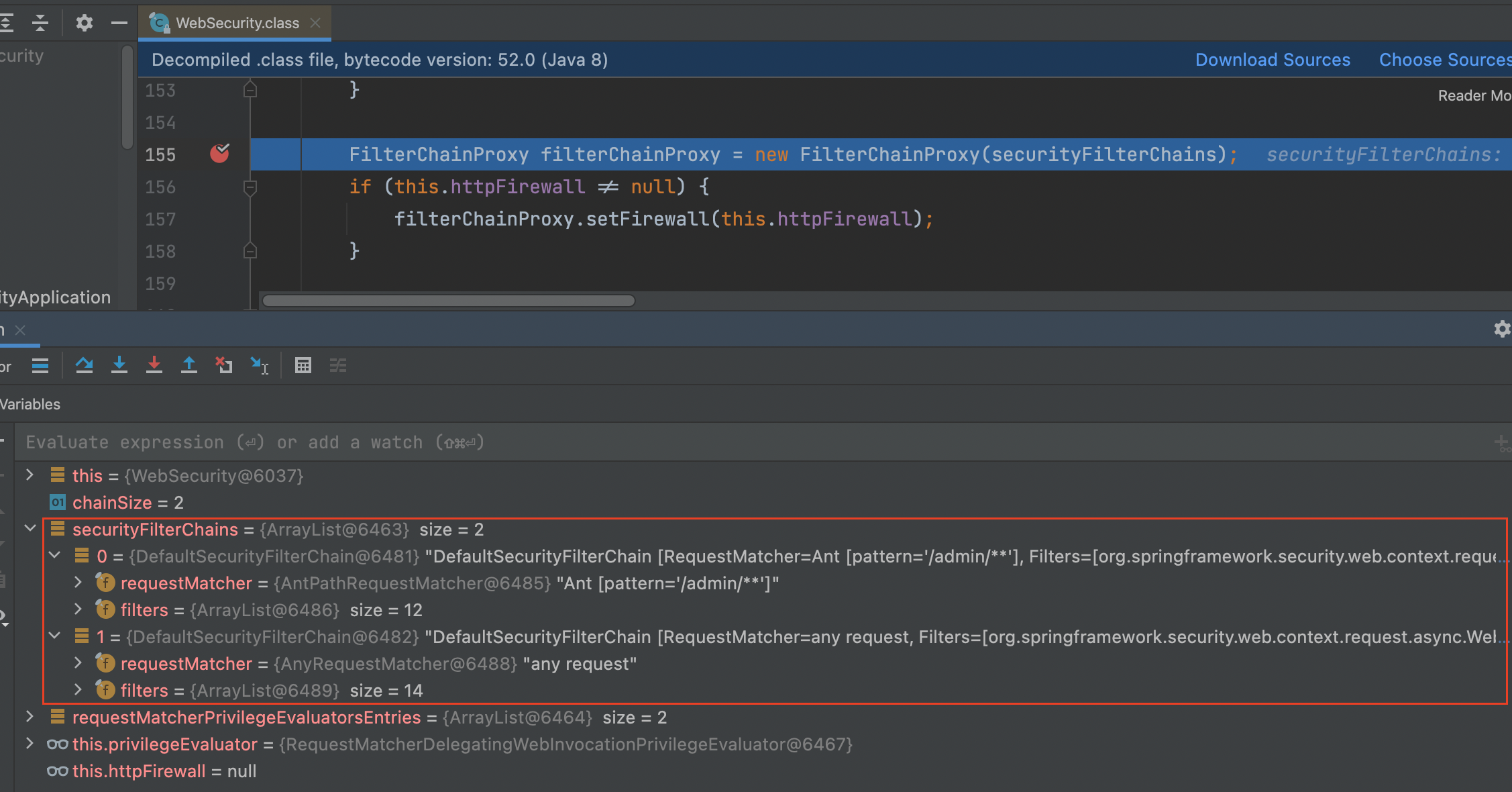디버깅 해보면 위 빨간 박스 안처럼 FilterChain 2개를 FilterChainProxy를 가지고 있다.