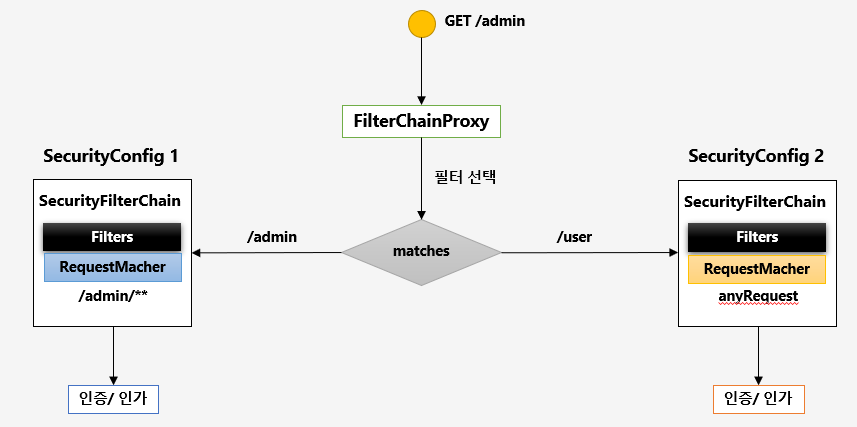-> FilterChainProxy가 저장하고있는 각각의 SecurityConfig 객체들에서 RequestMacher의 정보와 매치되는 정보를 찾게됩니다.