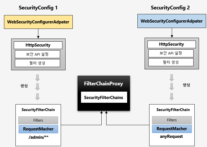 스프링 시큐리티에서는 보안 설정을 단일 설정이아닌 여러 개의 설정을 만들어서 동시에 사용을 할 수 있다.
