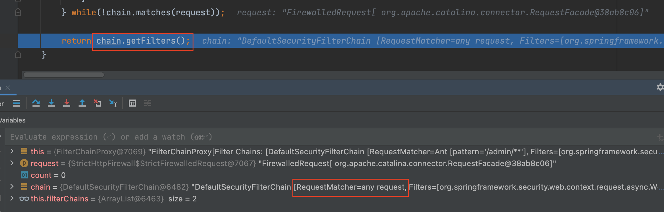 위 사진에서 하단의 chain 부분을 보면 [RequestMatcher=Ant [pattern=/admin/**']이 된다.