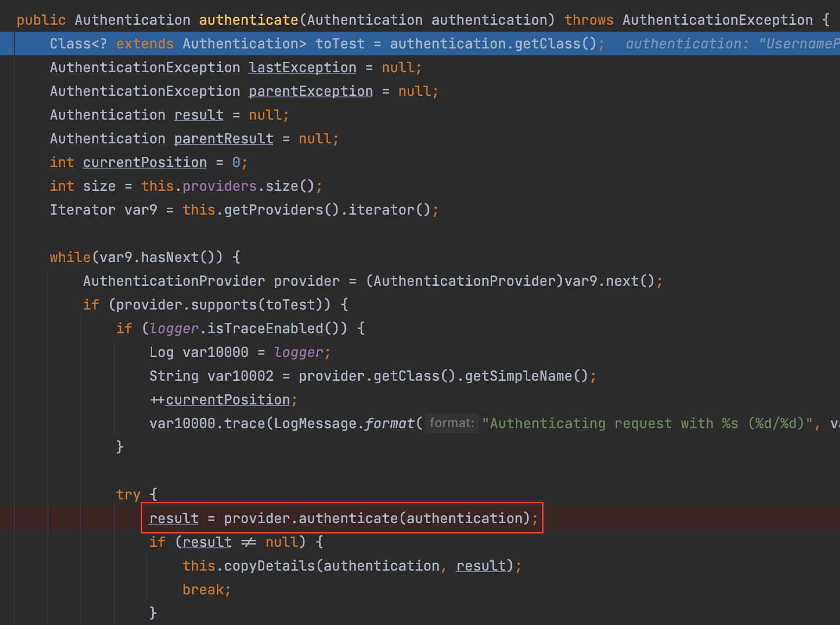다음 코드를 보면 AuthenticationProvider를 찾아와서 authenticate()를 호출하게 된다.