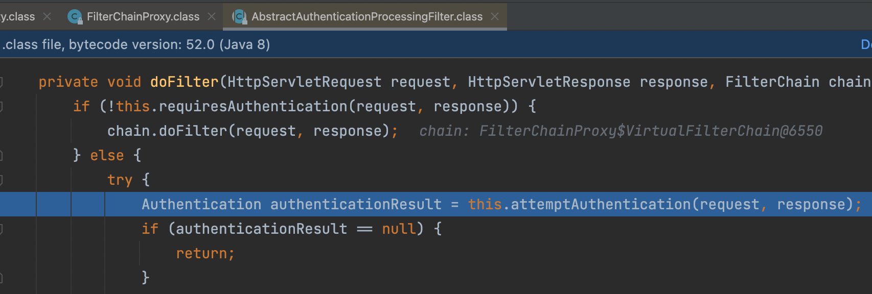 맨 처음 AbstractAuthenticationProcessingFilter에서 attemptAuthentication()에 걸리게 된다.