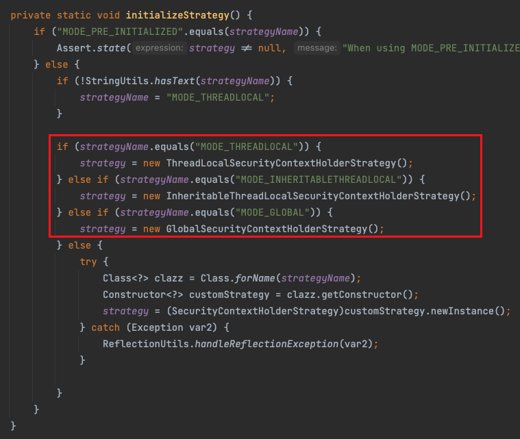 SecurityContextHolder는 처음에 다음 init 메서드를 호출하게 된다.