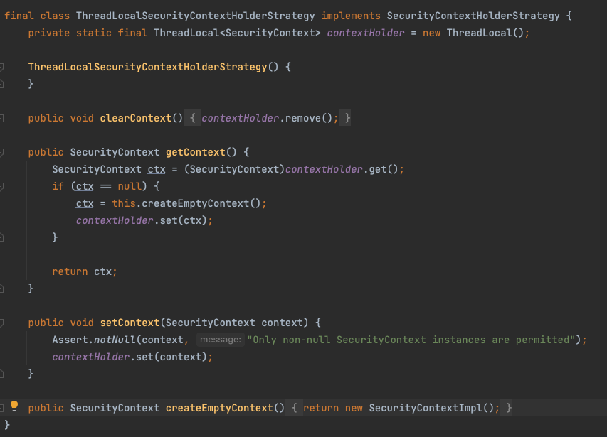 ThreadLocalSecurityContextHolderStrategy 클래스의 코드는 위와 같다.
