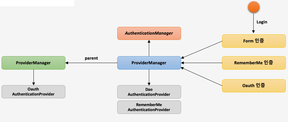 ProviderManager는 AuthenticationProvider 목록 중 인증처리 요건에 맞는 적절한 Provider를 찾아 인증처리를 위임하는 클래스.