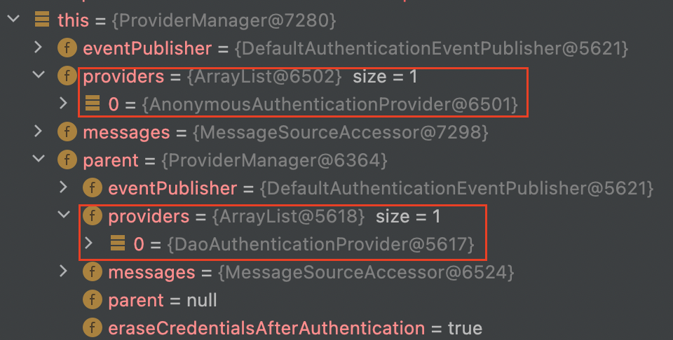 이전과 달리 parentAuthenticationManager로 직전에 만든 DaoAuthenticationProvider 가 지정된다.
