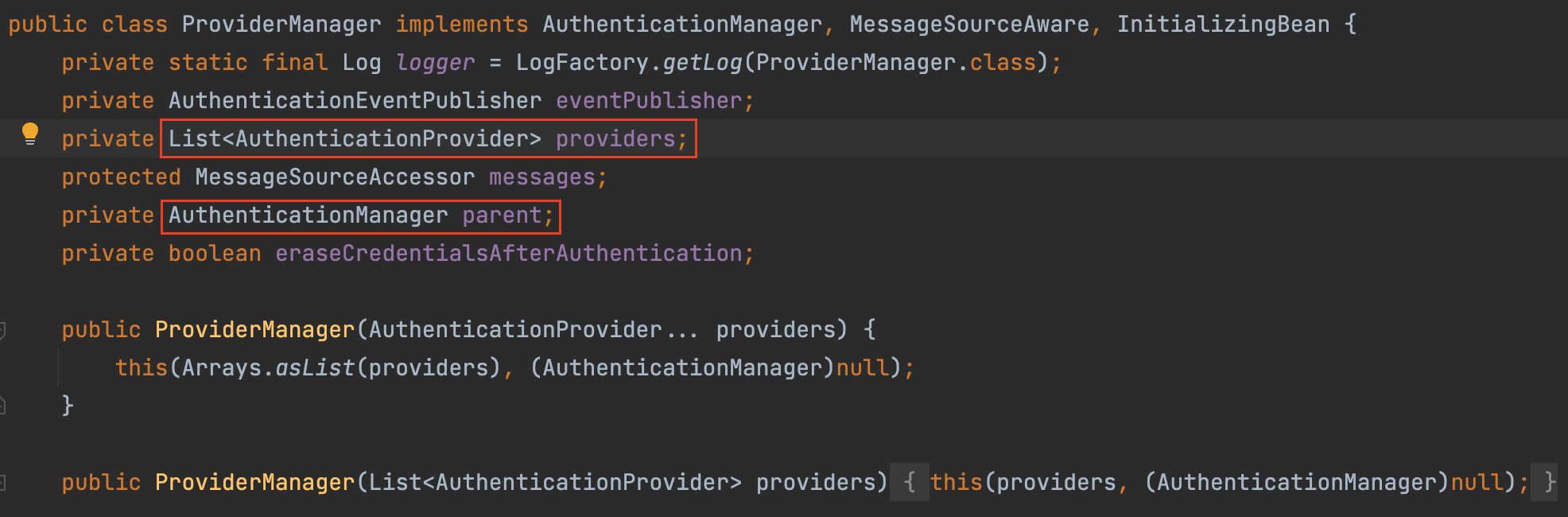 지금 생성되는 ProviderManager는 맨 처음 생성되었기 때문에 parent 에는 null이 넘어가게 된다.