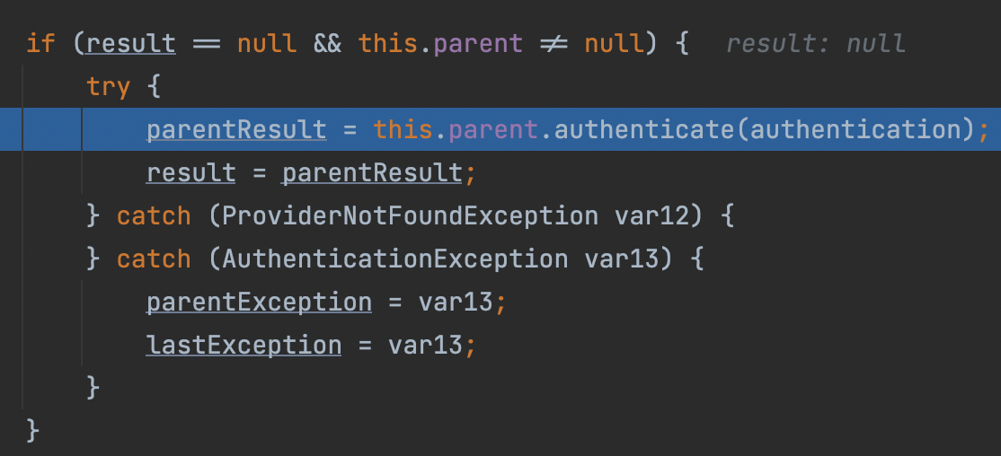적절한 AuthenticationProvider를 찾지 못하면 부모 ProviderManager에서 AuthenticationProvider 찾아보게 된다.