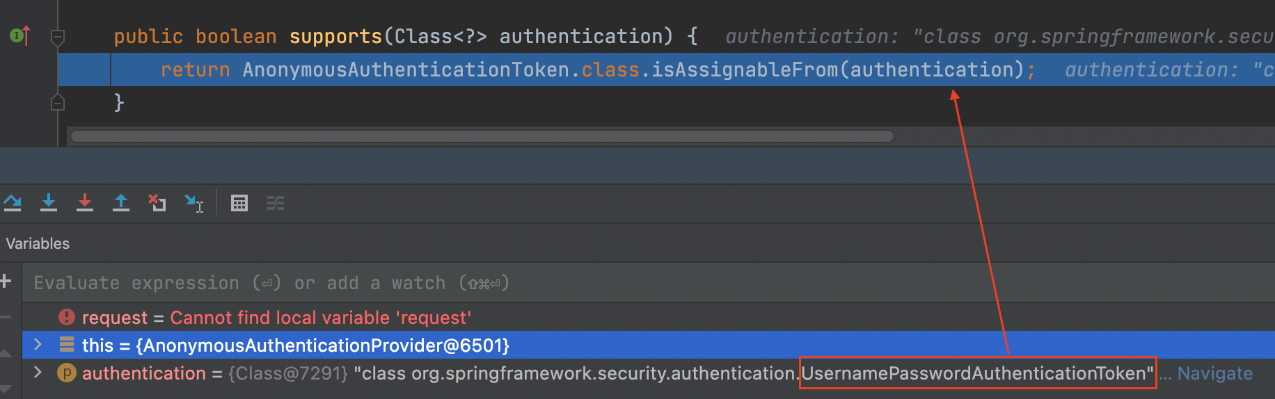AnonymousAuthenticationProvider 는 AnonymousAuthenticationToken을 받는데, UsernamePasswordAuthenticationToken이 넘어와 처리할수가 없다.