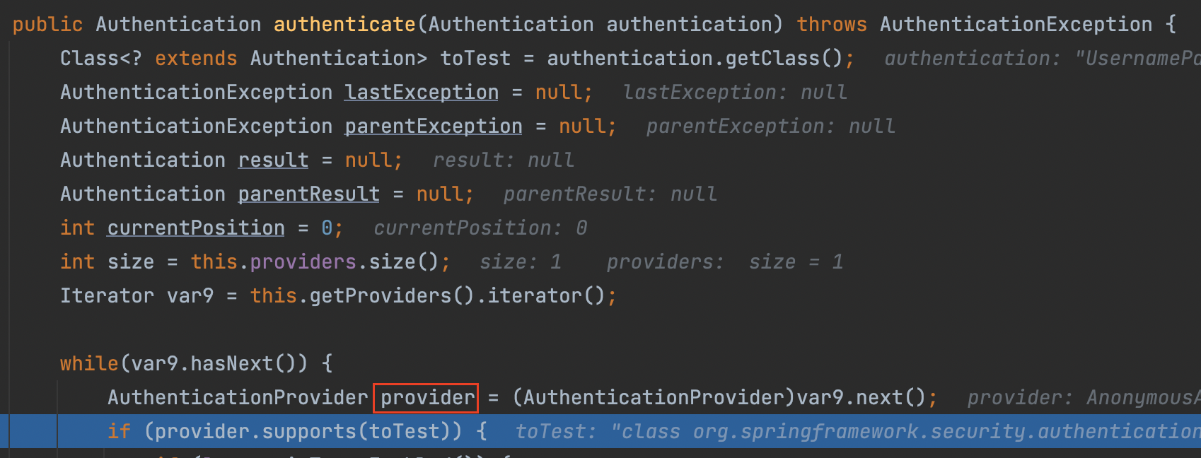 AuthenticationManger의 구현체인 ProviderManager로 넘어오게 된다.