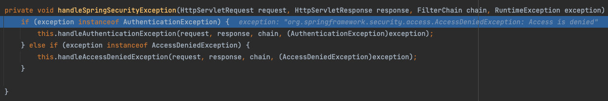 이렇게 발생한 예외는 위에서 말했듯 ExceptionTranslationFilter로 넘어온다.