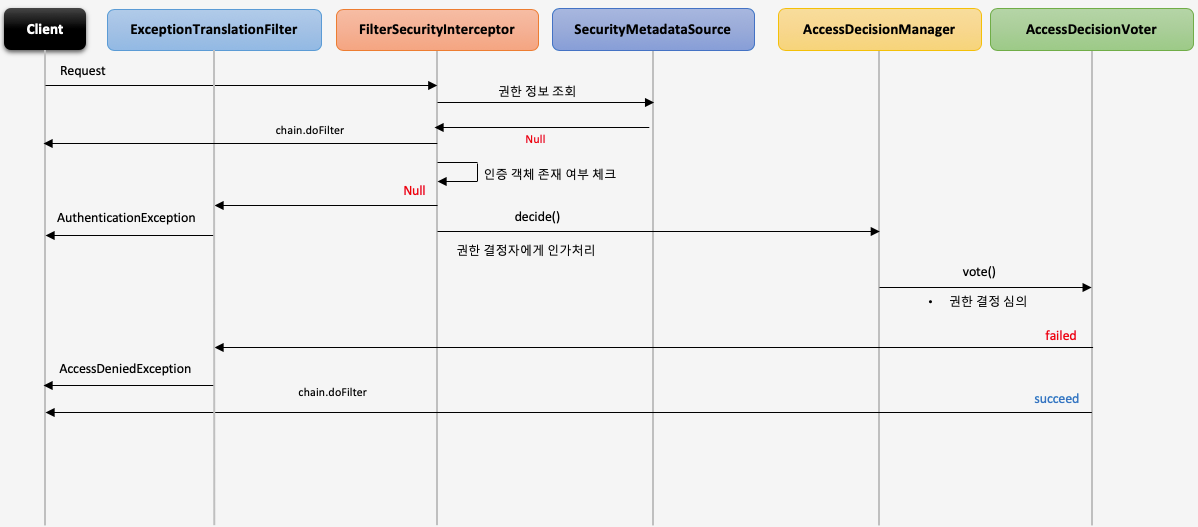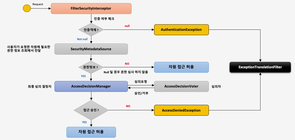 - 마지막에 위치한 필터로써 인증된 사용자에 대해 특정 요청의 승인및 거부 를 최종적으로 결정