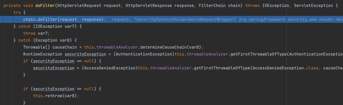 다만, try - catch 구문을 사용했기 때문에 그다음 호출되는 필터에서 발생한 예외들이 이곳에서 catch됨을 알 수 있다.