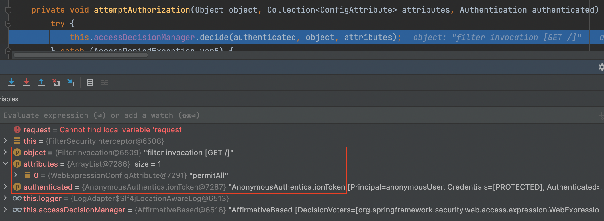이제 "/"로 접속해보자. AbstractSecurityInterceptor#attemptAuthorization()에 걸리게 된다.