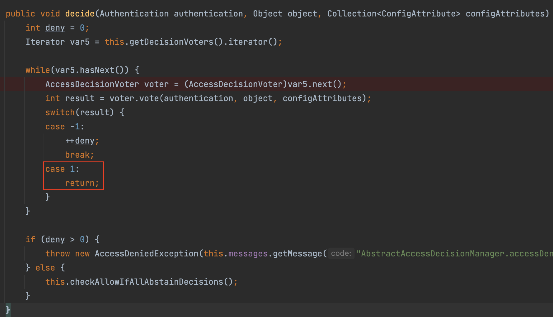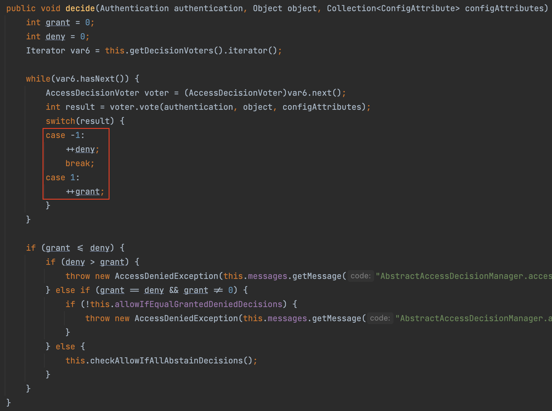 - ACCESS_ABSTAIN: 접근 보류(0) -> Voter가 해당 타입의 요청에 대해 결정을 내릴 수 없는 경우