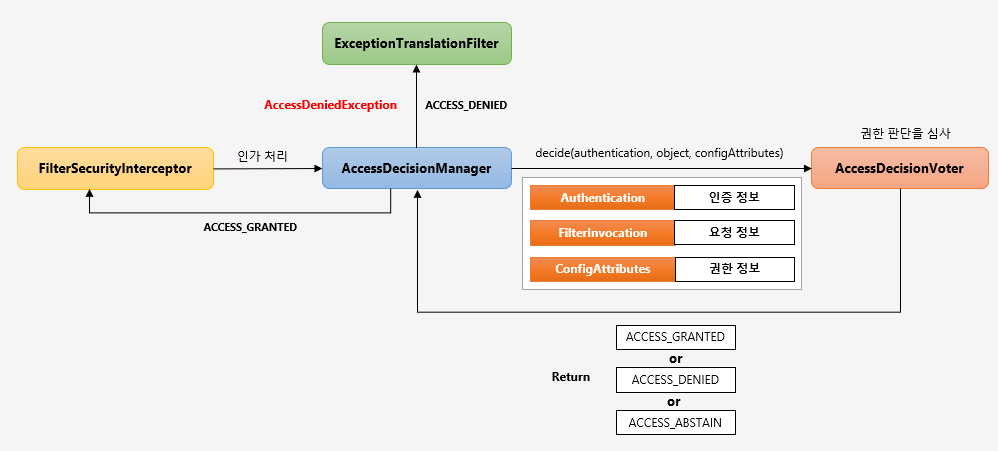 결정 방식 : AccessDecisionManager 은 반환 받은 결정 방식을 사용해서 후처리를 한다.