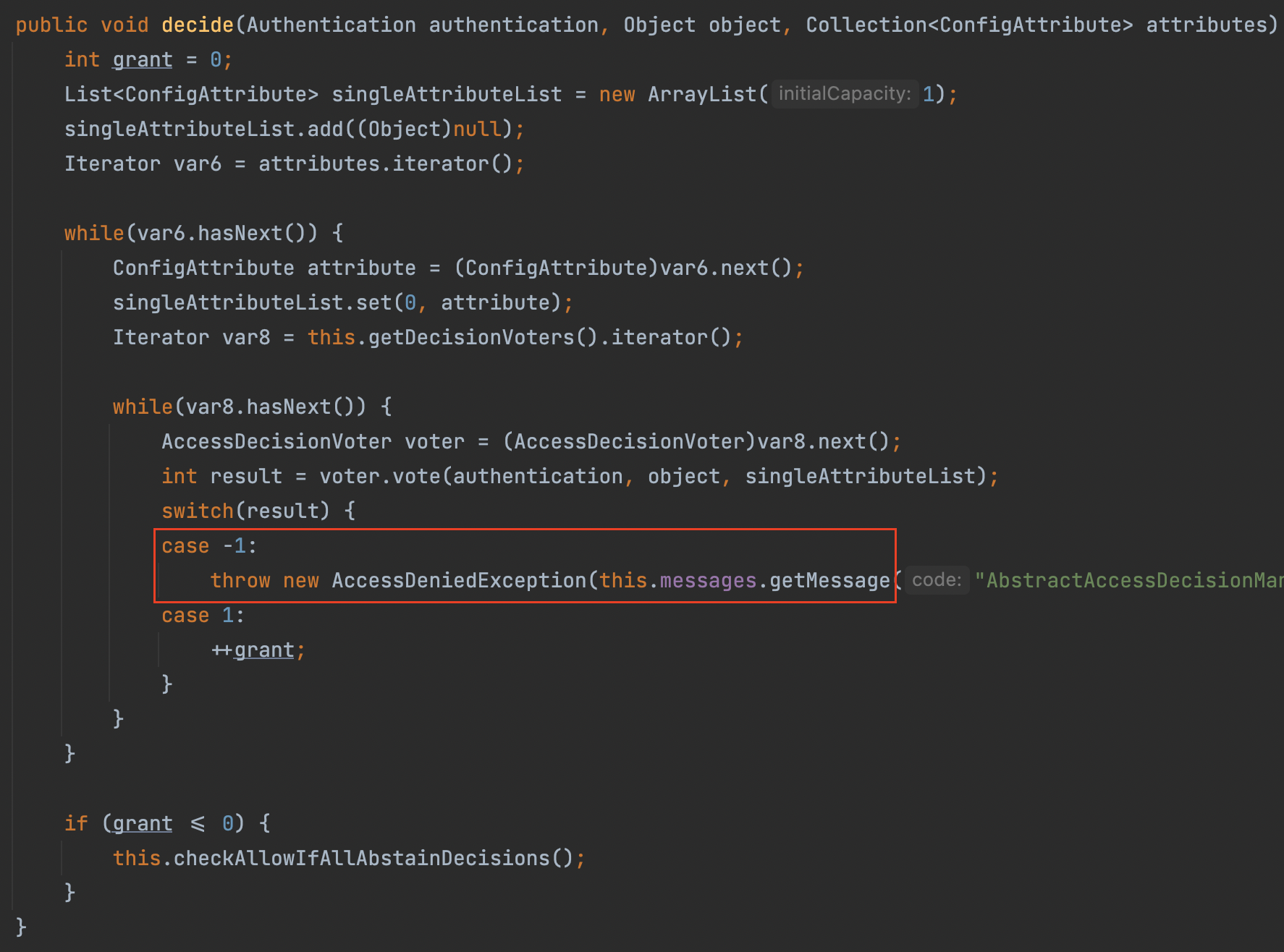 void decide(Authentication authentication, Object object, Collection<ConfigAttribute> configAttributes) throws AccessDeniedException, InsufficientAuthenticationException;