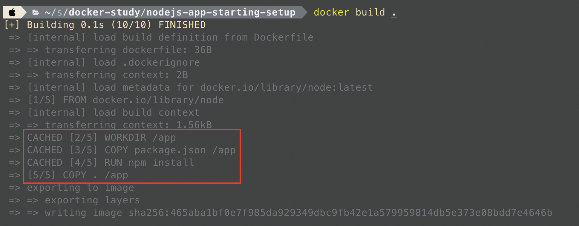 위 3개의 step 이 모두 CACHED 수식어가 붙어있다! 즉 캐시 된 결과를 사용하여 빠른 시간에 빌드한 것이다.