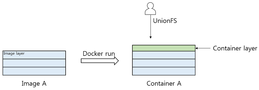 복사 후 docker는 이미지의 최상단에 컨테이너 레이어(Container layer)라고 불리는 하나의 얇은 레이어를 추가하여 컨테이너를 생성한다.
