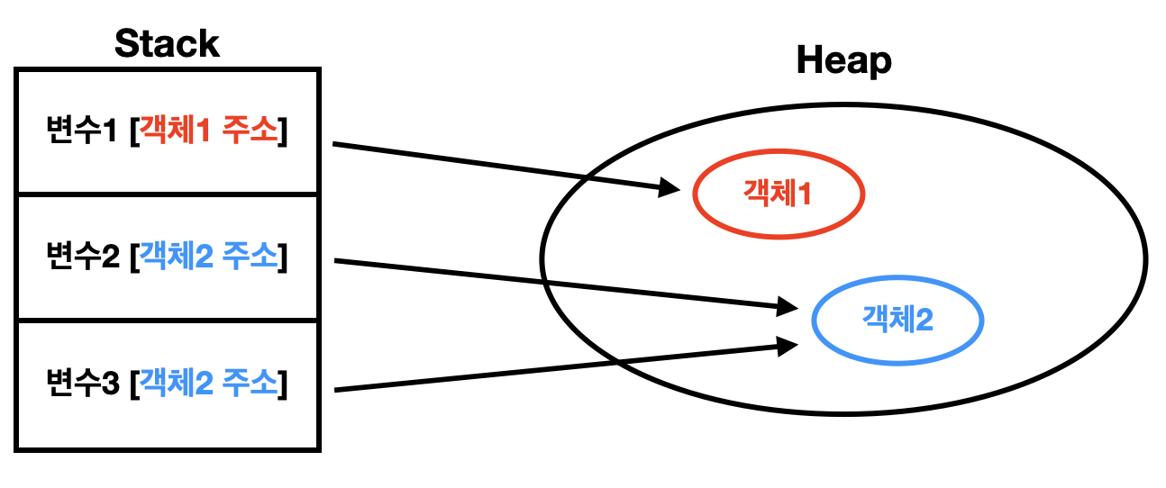 변수 1은 객체1을 가리키고 있고, 변수2 와 변수3은 객체2를 가리키고 있다.
