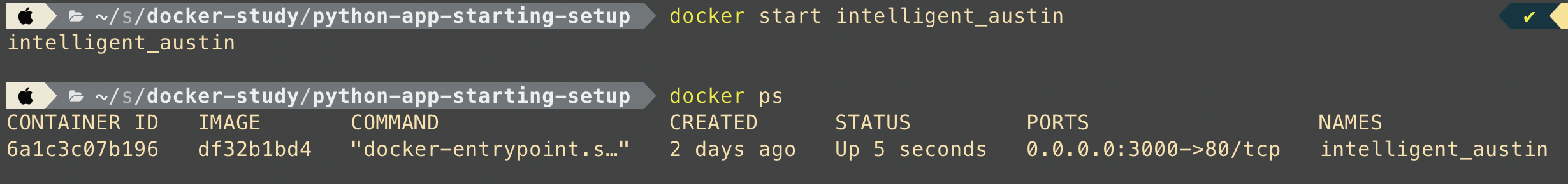 또한 컨테이너를 재 실행할 때는 "-a -t"옵션만 추가해주면 됩니다.