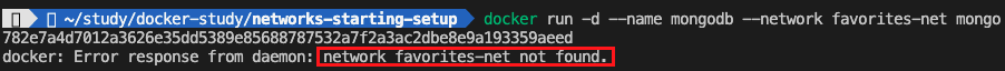 다음과 같이 "--network favorites-net"을 추가 옵션으로 설정하고 run 하면 해당 네트워크를 찾을 수 없다고 나옵니다.