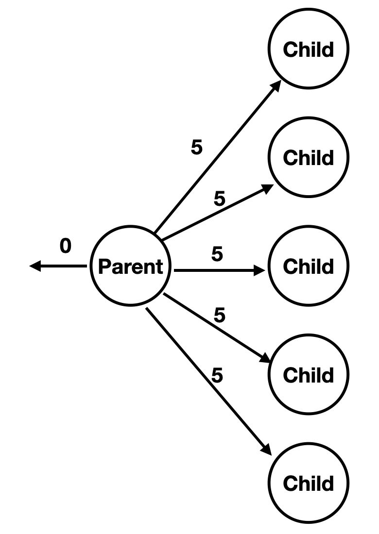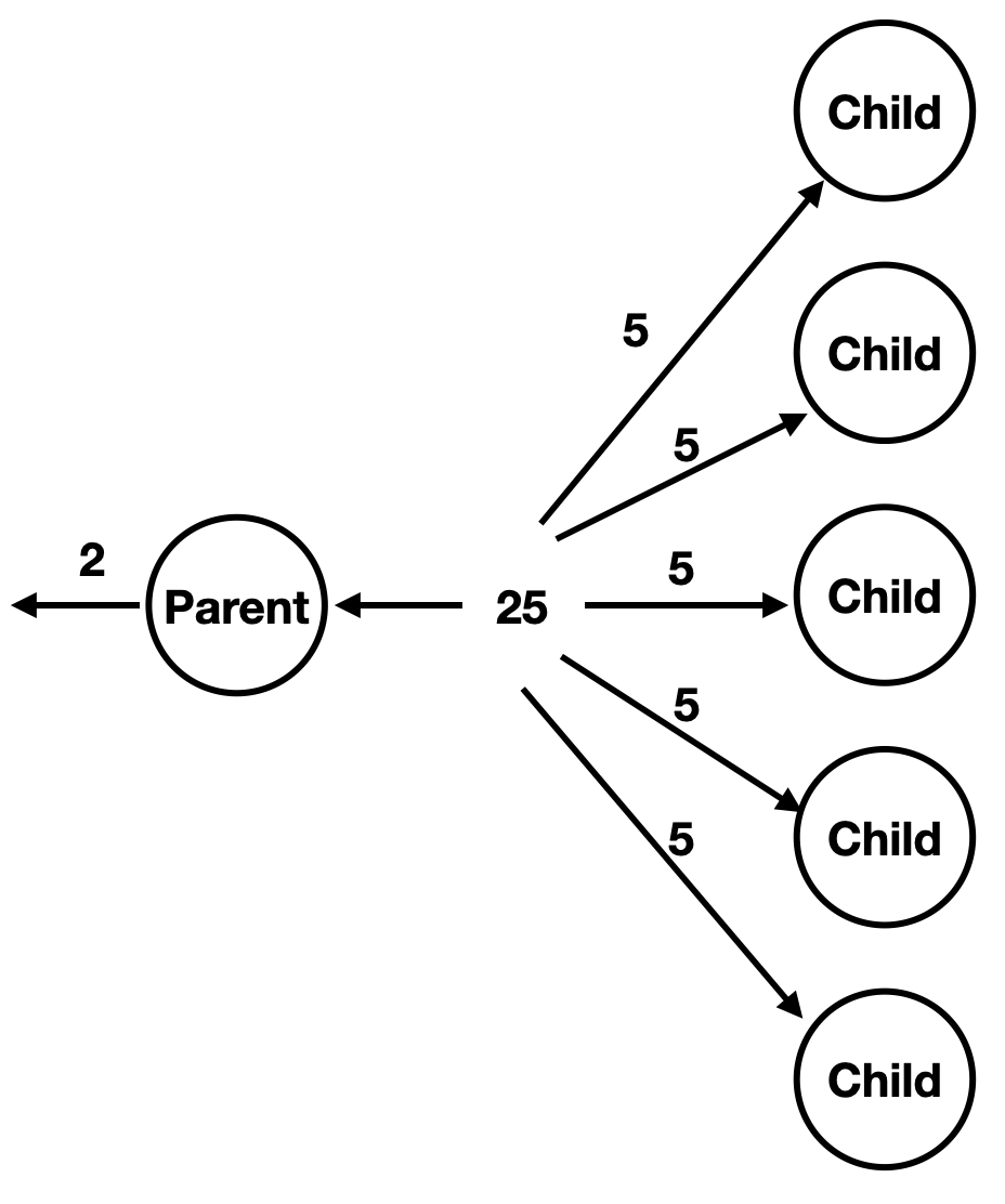 각각이 5씩 반환한다면 Parent는 5원의 10%는 0.5원으로, 1원 미만이기 때문에 자신이 5원을 전부 갖게된다.