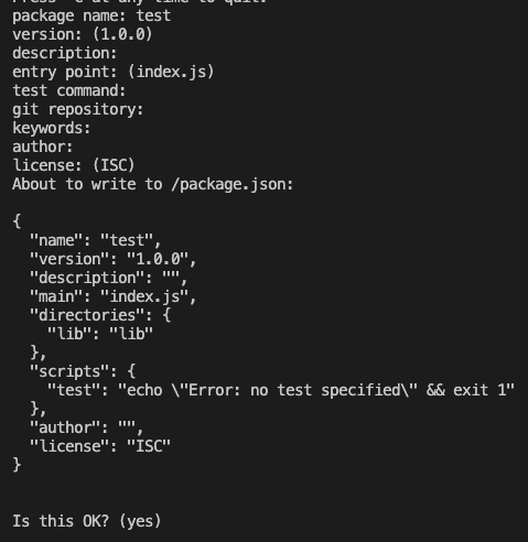그러면 node의 쉘 모드가 진행되는 것 이 아니라, npm init을 수행하게 됩니다.