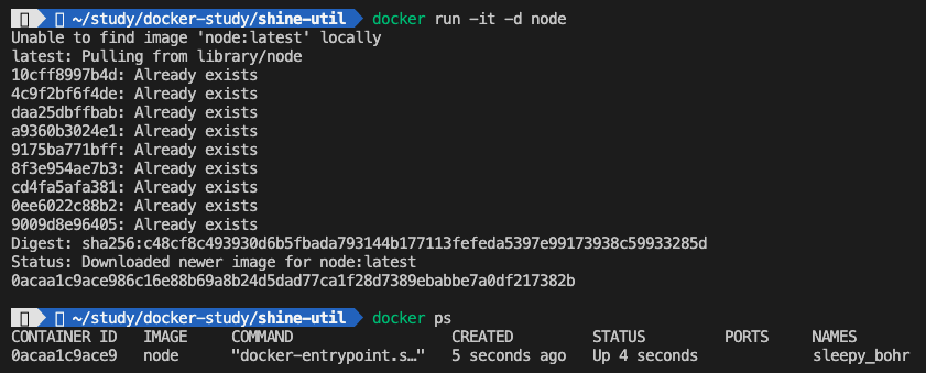 ps를 통해 살펴보면 sleepy_bohr 이라는 이름의 node 컨테이너가 실행 중임을 알 수 있습니다.