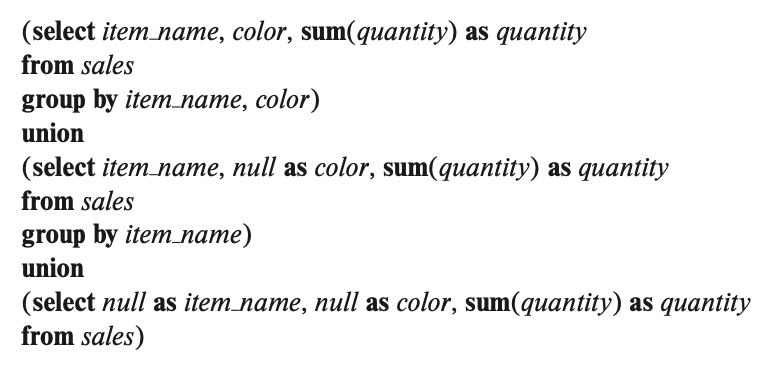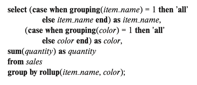 다른 그룹의 결과로부터 공통의 스키마를 만들기 위해 rollup을 사용했듯, 결과에 있는 튜플들이 특정 그룹에 출현하지 않는 속성의 값을 null값을 사용하게 된다.