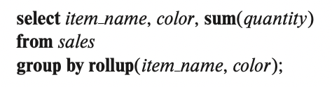cube와 rollup은 다수의 group by 질의가 단일 질의에서 수행되고 결과도 단일 릴레이션으로 반환되도록 해준다.