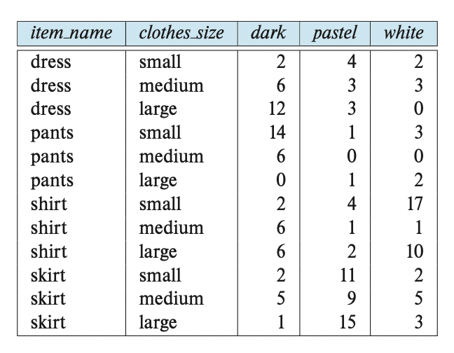 일반적으로 cross-tabulation은 어떤 릴레이션 R의 특정 속성의 값이 속성이 되는 테이블이라 할 수 있다.