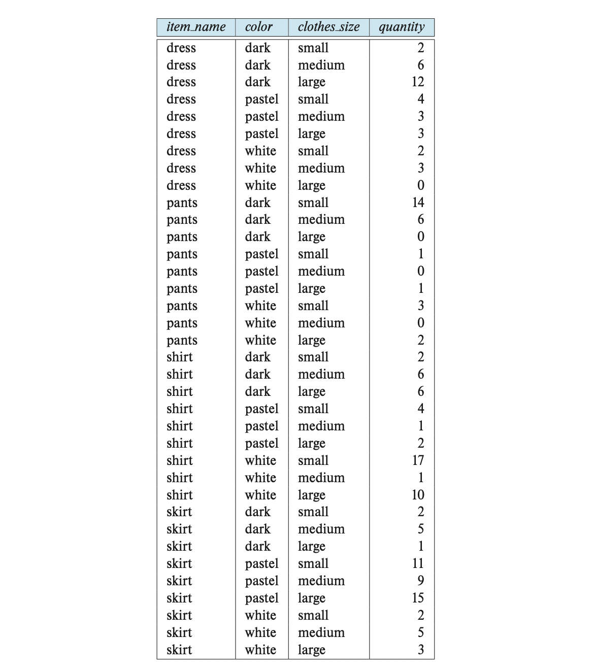 item_name은 (skirt, dress, shirt, pants)중 하나, color은 (dark, pastel, white)중 하나, clothes_size는 (small, medium, large)중 하나의 값을 각각 가지고, quantity는 주어진 품목의 전체 수를 나타내는 정수 값이다.