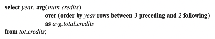 dept_name으로 분할된 각각의 학과를 다루는 윈도우 질의를 다음과 같이 작성할 수 있다.