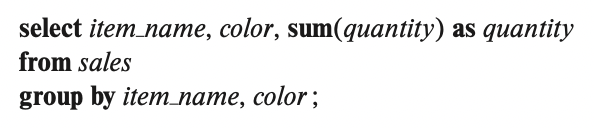 rollup의 경우 앞에 나와 있는 속성(item_name), 그리고 두 개의 속성을 모두 포함하는 (item_name, color) 그룹이 만들어진다.